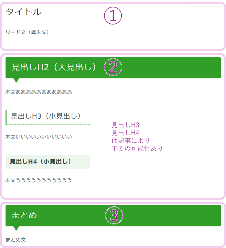 - 「タイトル→リード文→見出し→本文→まとめ文」お順番で書く